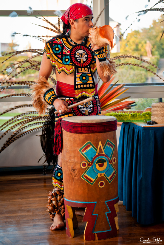 Er ist aus Mexiko eingeflogen…macht auch persönliche Horoskope /// Nein 2012 geht die Erde nicht unter, aber man sagt das Zeitalter der sechsten Erde kommt, die Menschen werden bewusster, daher habe ich auch sechs Blumen an meinem Kostüm /// Der Schlangentanz ist für ein langes Leben und Lebensfreude, zu Ehren Mutter Erde und um sich mit der Energie der Erde zu verbinden /// Zu bestimmten Festen tanzen wir 16 Stunden am Stück und machen nur ein bisschen Pause zum essen, trinken, schlafen /// Viele in Europa denken Indianer seien weniger entwickelt, dabei habt ihr Tomaten, Schokolade und Kartoffeln von uns, aber ich bin froh dass nicht alle so denken.